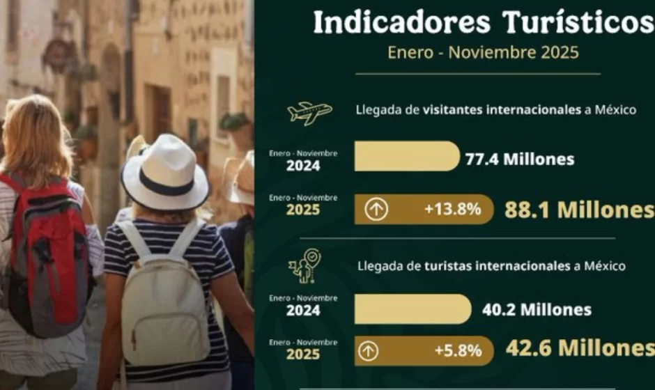 México cerró de enero a noviembre de 2025 uno de los mejores periodos turísticos de su historia, al registrar la llegada de 88.1 millones de visitantes internacionales, lo que representa un crecimiento de 13.8 por ciento en comparación con el mismo periodo del año anterior, informó la secretaria de Turismo del Gobierno de México, Josefina Rodríguez Zamora.