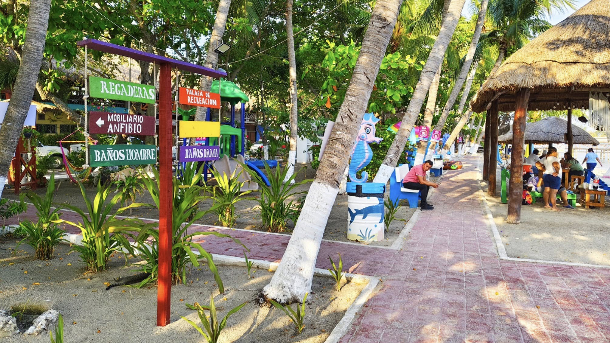 El espacio ofrece palapas, tumbonas, mesas, parrillas, baños y regaderas con tarifa accesible, además de un pequeño malecón y una cancha de fútbol de arena. Su diminuto muelle, muy querido por los habitantes locales, es perfecto para la pesca o para contemplar el paisaje. Las aguas calmas permiten nadar sin preocupación, dar paseos en lancha o descansar a la sombra de los cocoteros y manglares. Con un poco de suerte, incluso se pueden avistar aves endémicas y delfines nariz de botella, especialmente al atardecer.