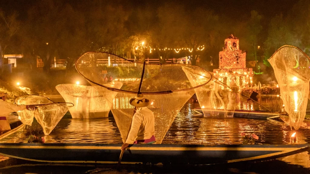 Uno de los momentos más emblemáticos se vive durante “El Camino de las Ánimas”, un espectáculo que ilumina la noche con velas y flores de cempasúchil. A través de 19 pasajes históricos y la participación de más de 120 habitantes, la comunidad comparte la cosmovisión purépecha sobre el regreso de los difuntos, transformando el lago en un escenario lleno de simbolismo, memoria e identidad.